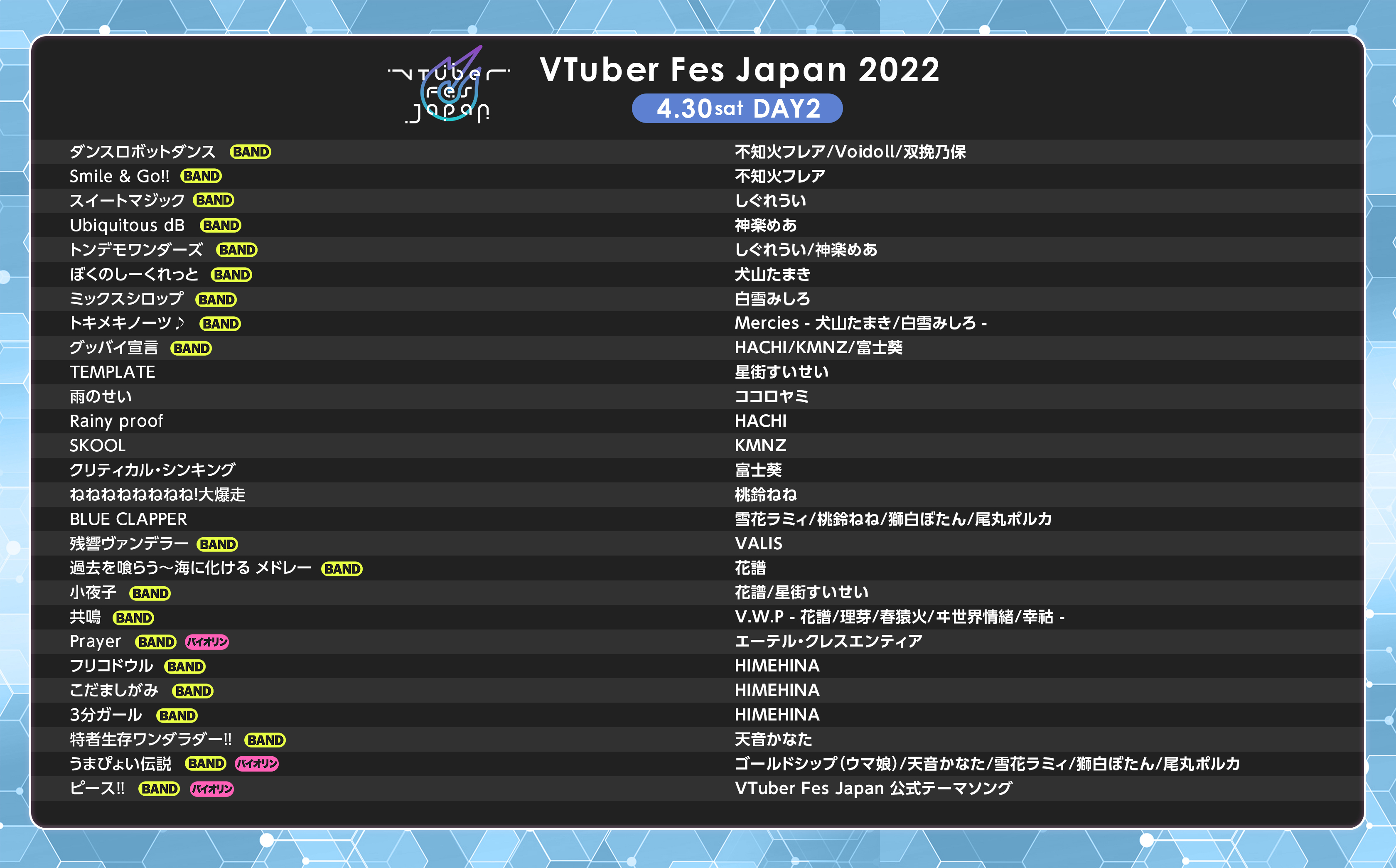 さて、そんな機材トラブルなんですが、対応としては生バンドとヒメヒナとバックダンサーたちが「ずれたことを想定した上で演奏・パフォーマンスをする」という神業にも等しいアドリブで乗り切っていました。その影響でDAY2のライブのパフォーマンス面はトラブルあったことを考えても非常に素晴らしいクオリティだったと思います。ただし、上でも触れておりますが観客が参加するコーレスや歌唱といった部分でのフォローが全くできていなかったのが残念でした。が、これはもうどうしようもないこと。むしろよくあの状態で最低限のクオリティを保証出来たなと自分はララスタという会社の職人ぶりに感動でございました。DAY2のトラブルのあった箇所は、不本意なパフォーマンスだったということで映像として残すつもりはないと公式のアナウンスがあったため、前述の神業パフォーマンスに関してはDAY2を現地参加した人とリアルタイムで配信を見ていた人たち(アーカイブでは遅延のあった曲の部分はDAY1の映像に差し替えられている)だけが見ることが出来た一度限りのライブとなりました。事故だったとはいえ唯一無二のパフォーマンスを見届けられたことを自分はポジティブに良かったことだと受け止めます。