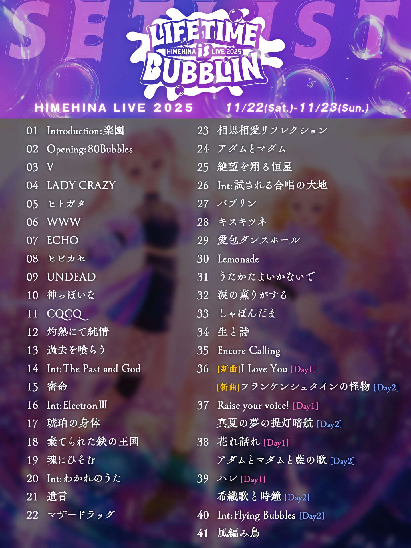 まずセトリなんですが、DAY1とDAY2で9割一緒です。ライブタイトルにもなっている最新の4thアルバム「Bubblin」が中心となっていますね。アンコールの部分のみ歌った曲と発表された特報情報の内容に相違がありました。したがって、感想は日ごとでは分けず両日を統合してまとめます。