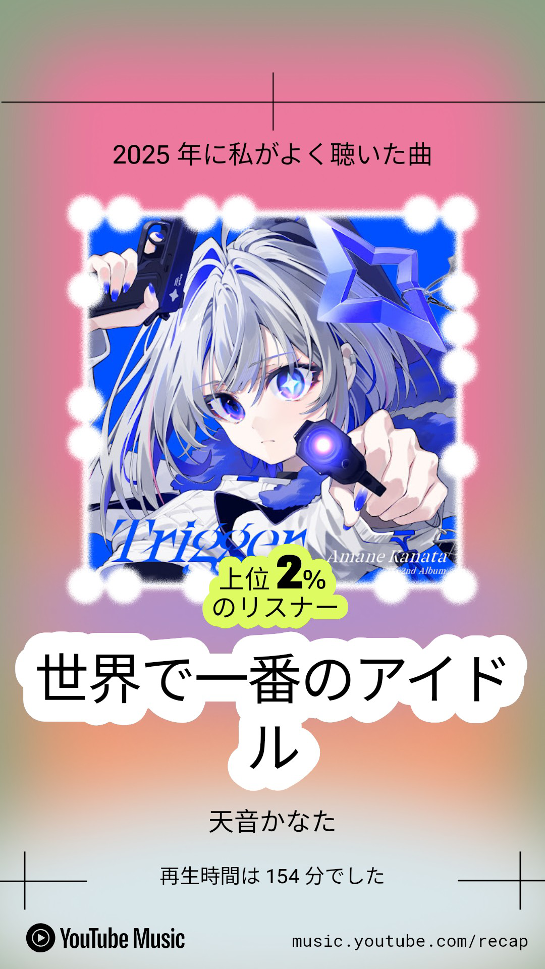 余談ですが、実はこの「世界で一番のアイドル」、自分が2025年において最も聴いた楽曲としてYoutube musicで記録されています。