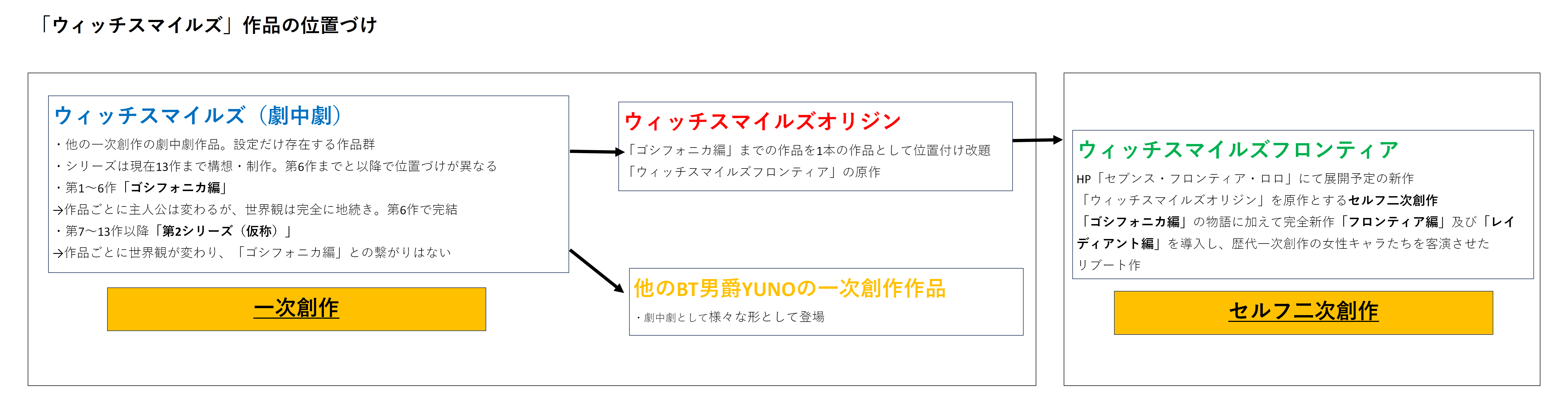 分かりやすい例で言うなら、「新世紀エヴァンゲリオン」(=「ウィッチスマイルズオリジン」)からの「ヱヴァンゲリヲン新劇場版」(=「ウィッチスマイルズフロンティア」)みたいな位置づけでしょうか。